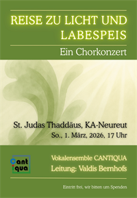 Das Vokalensemble CANTIQUA (Karlsruhe - Bruchsal) führt das Publikum durch Klangräume, in denen sich Trost und Zweifel, Licht und Schatten berühren. Alte Gebete flüstern neben weltlichen Liedern, leise Ironie blitzt auf, wo man sie nicht erwartet. Zwischen meditativer Tiefe und überraschender Leichtigkeit entfaltet sich ein Abend, der nicht alles erklärt - aber vieles spürbar macht.